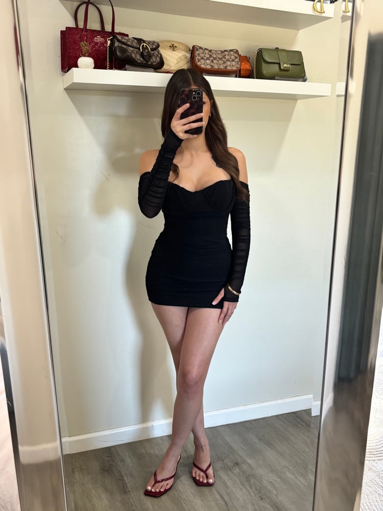 Black rhinestone dress Off the shoulder Neck string tie Padded inserts included Zip up Double layered Mesh top layer w/ black rhinestones True to size Model wearing a size small Final sale