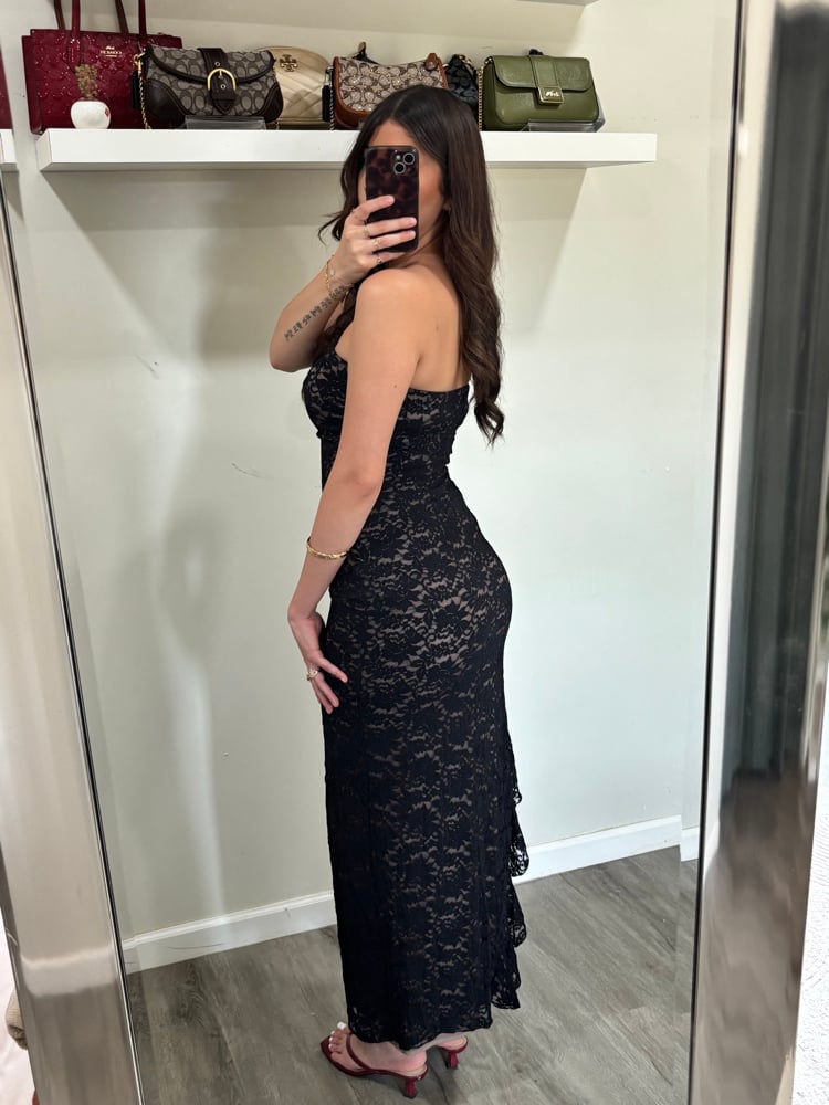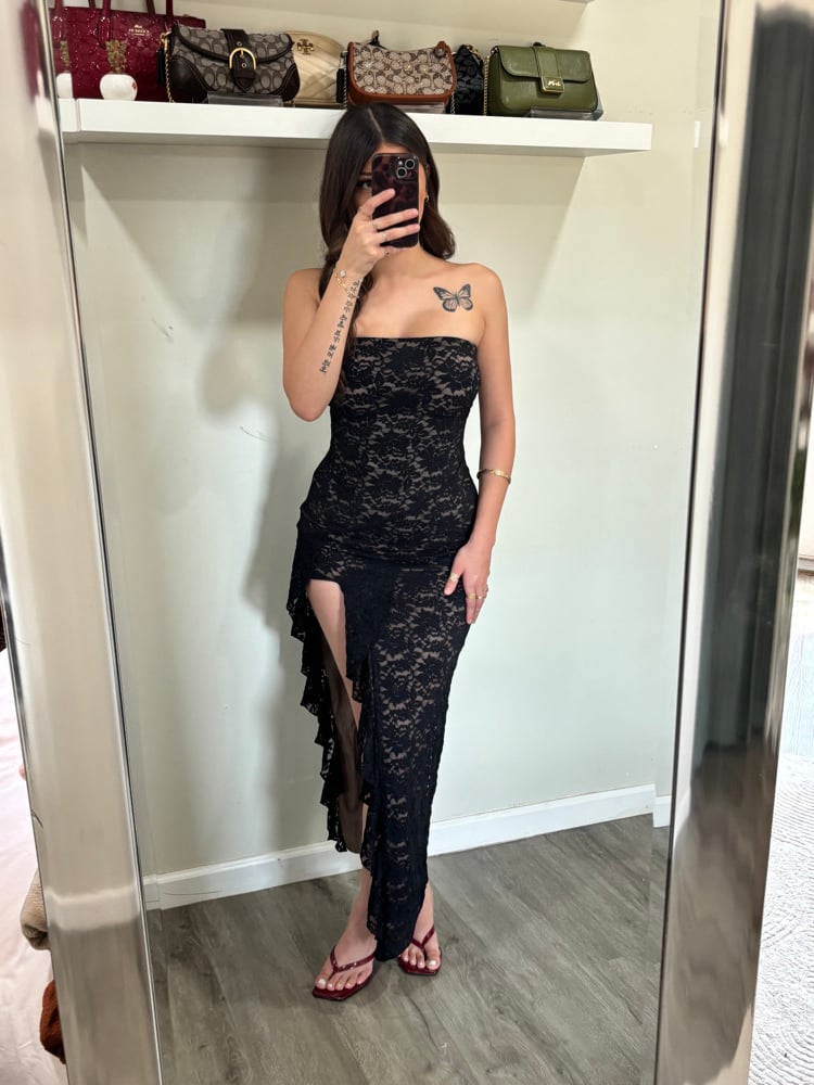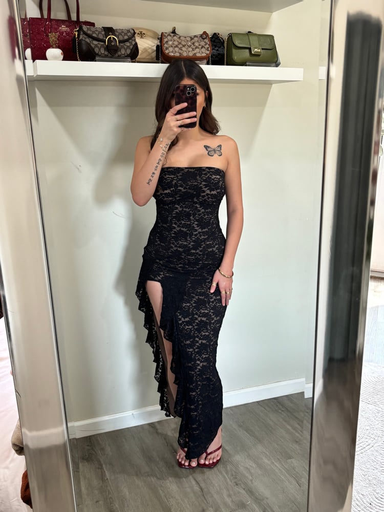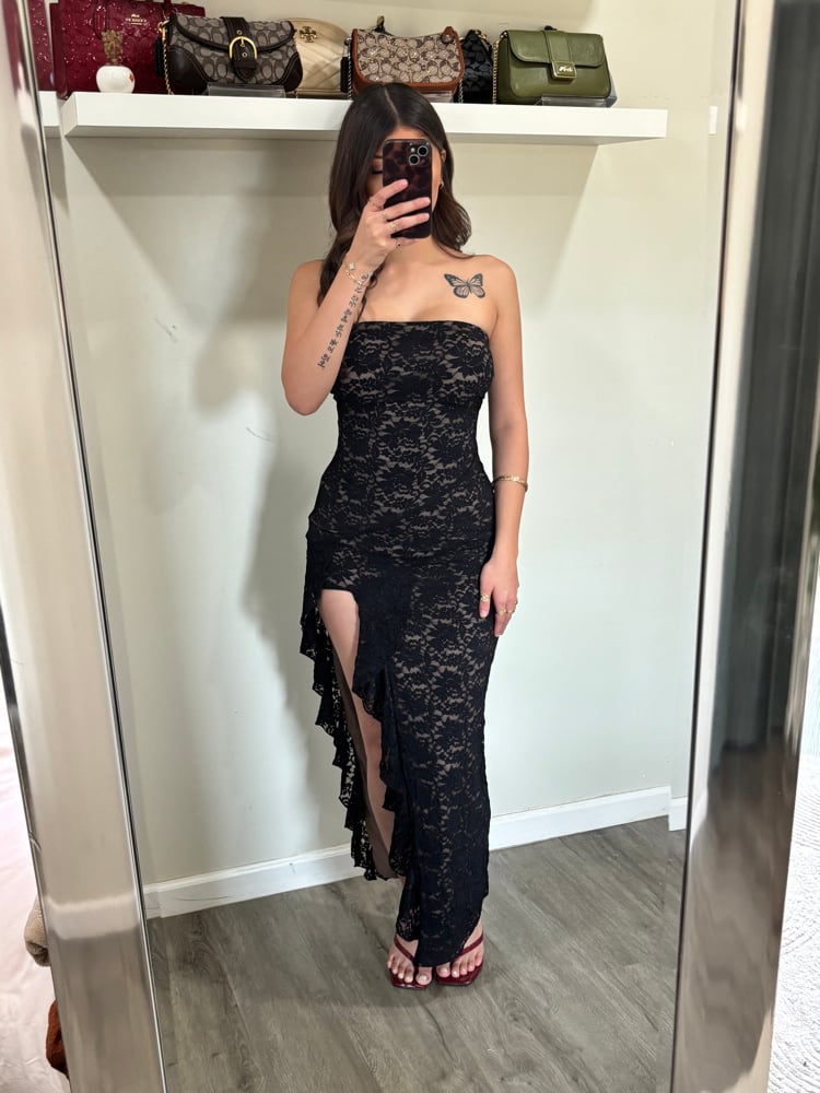 lace maxi dress black/nude double layered open leg slit ruffle leg opening true to size model wearing a size small